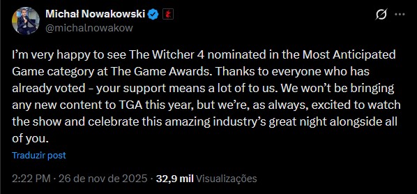Na postagem, ele agradeceu a indicação de The Witcher 4 ao prêmio, mas confirmou que não haverá nenhuma novidade sobre o jogo durante o evento.